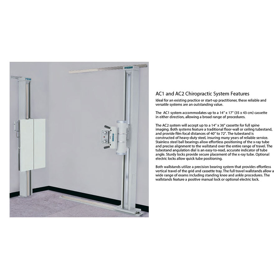 The AC1 system accommodates up to a 14? x 17? cassette in either direction, allowing a broad range of procedures. The wall stands utilize a precision bearing system that provides effortless vertical travel of the grid and cassette tray. Full traveling wall stands allow a wide range of exams including standing knee and ankle procedures. The wall stands feature a positive manual lock or optional electric lock.