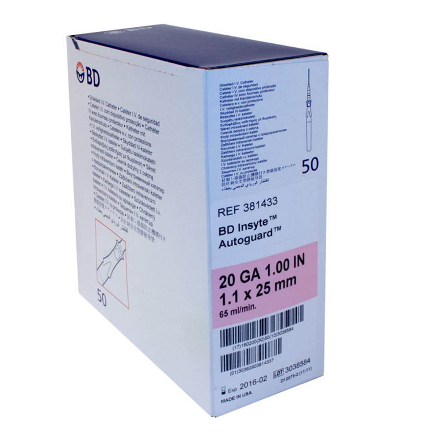 Insyte Autoguard shielded 20 Gauge x 1 Inch Peripheral IV Catheter with blood control technology and button retracting needle to reduce needlestick injuries.
