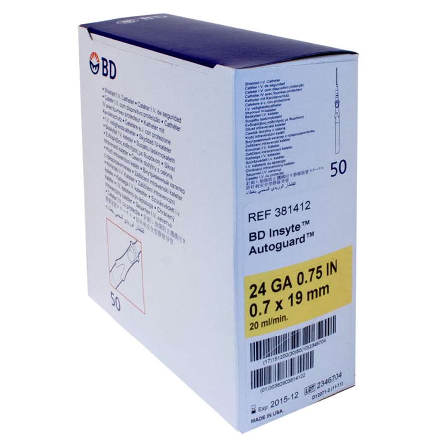 Insyte Autoguard 24 Gauge 0.75 inch peripheral IV catheter with button retracting needle to reduce needlestick injuries.