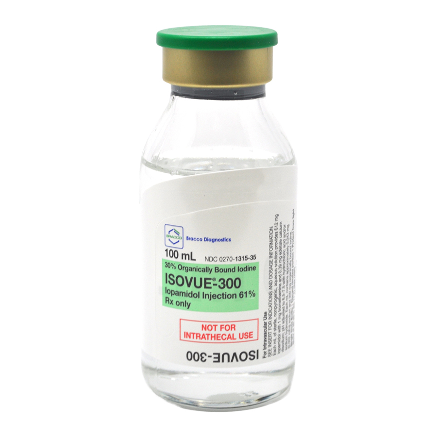 10 x 100mL bottles of Isovue-300 Iopamidol 61%, a radiopaque (RAY dee oh payk) contrast agent. This medicine contains iodine, a substance that absorbs x-rays. Radiopaque contrast agents are?used?to allow blood vessels, organs, and other non-bony tissues to be seen more clearly on a CT scan or other radiologic (x-ray) examination.