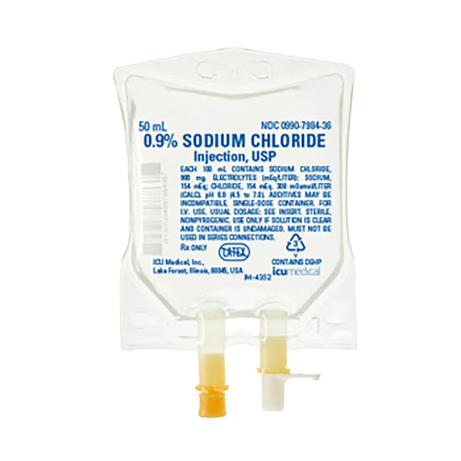 80 x 50mL bags of Sodium Chloride solution (NaCl) 0.9%. Sodium chloride solution intended for intravenous injection. Nonpyrogenic parenteral solution of electrolyte replenishers in water.