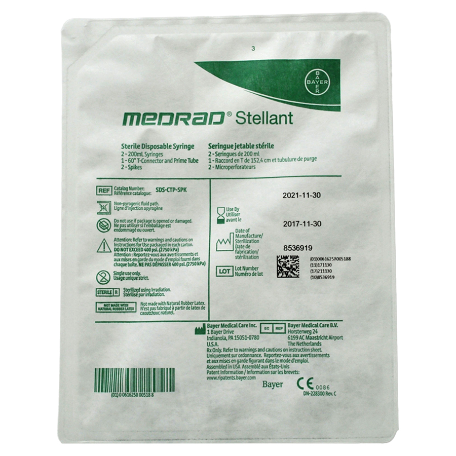 The Medrad Dual Syringe 200ml T-Connect is a high-quality product designed for use with Medrad Stellant D injectors. This syringe kit is essential for professionals working in CT imaging, offering precision and dependability. The package includes two 200ml syringes, one 60-inch T-Tubing, and two fill spikes. It is specifically created to ensure smooth and accurate delivery of contrast media for computed tomography (CT) procedures.