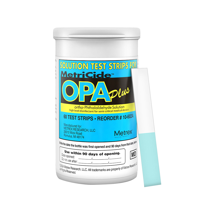 MetriCide OPA Plus Solution Test Strips are a concentration monitor dedicated for use with MetriCide OPA Plus with a minimum recommended concentration (MRC) of 0.3%