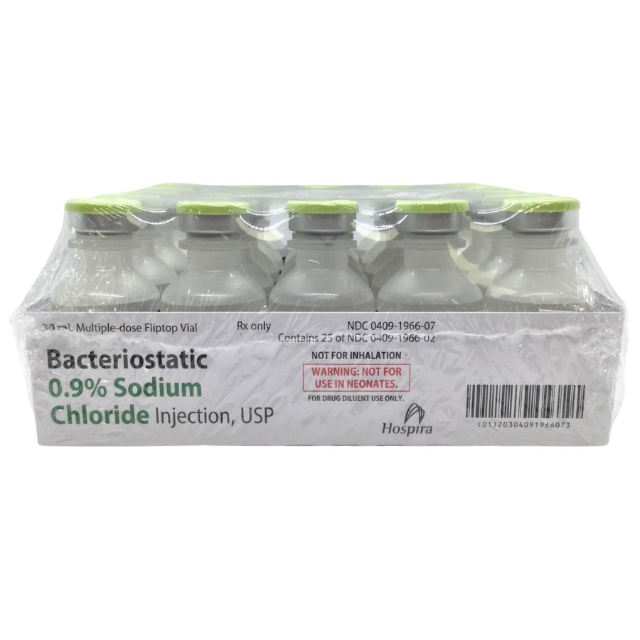 25 x 30mL vials of Bacteriostatic Sodium Chloride (NaCl BAC) 0.9%. This preparation is designed for parenteral use only after addition of drugs that require dilution or must be dissolved in an aqueous vehicle prior to injection. Each milliliter (mL) contains sodium chloride 9 mg and 0.9% (9 mg/mL) benzyl alcohol added as a bacteriostatic preservative.