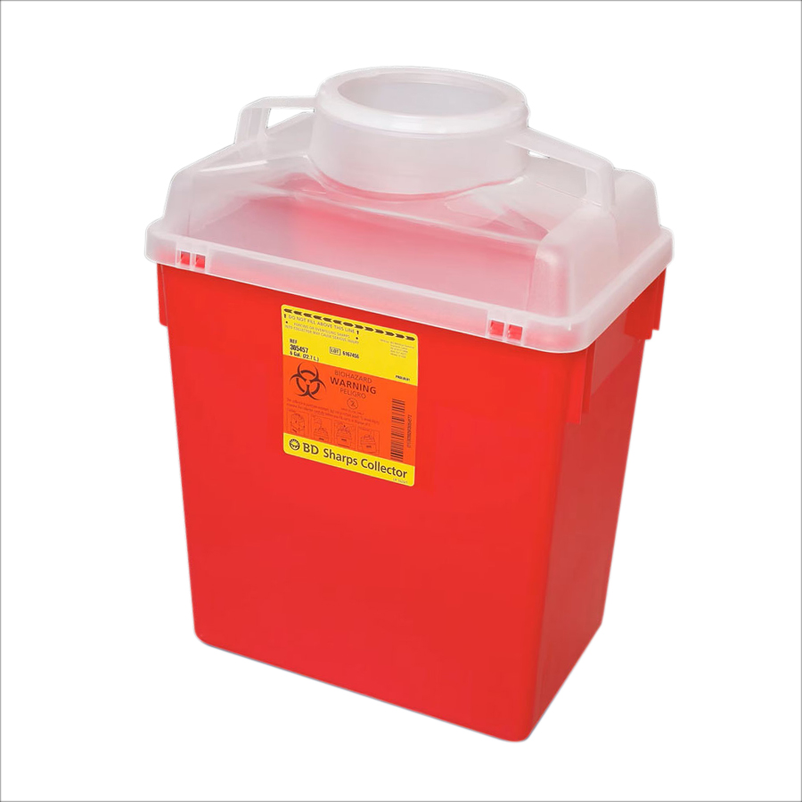 Nestable; Color Red Base / Clear Lid; Dimensions: 17-1/2 H X 12-4/5 W X 8-4/5 D Inch; Lid Style: Vertical Entry; Lid Type: Hinged Snap On Lid; Material: Polypropylene; Safety Feature: Handles; Style: Nestable Waste Can Style with Absorbant Pad; Volume: 6 Gallon
